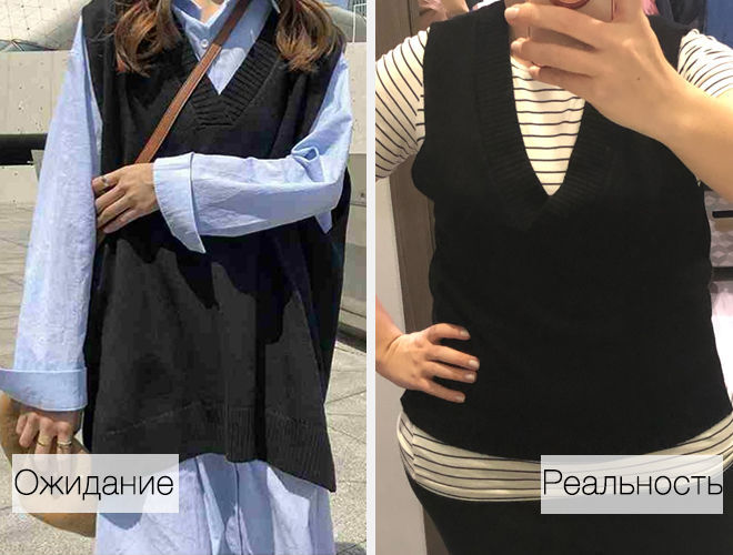На фото: однотонный свитер-жилет с V-образным вырезом, от 639 руб. Сам по себе такой предмет одежды сегодня — безусловный тренд: тепло, красиво, стильно. Чем свободнее и длиннее модель, тем лучше она будет смотреться. Но судя по фото из раздела «Отзывы», стоит поискать похожий в магазинах своего города, где точно не случится такого конфуза.