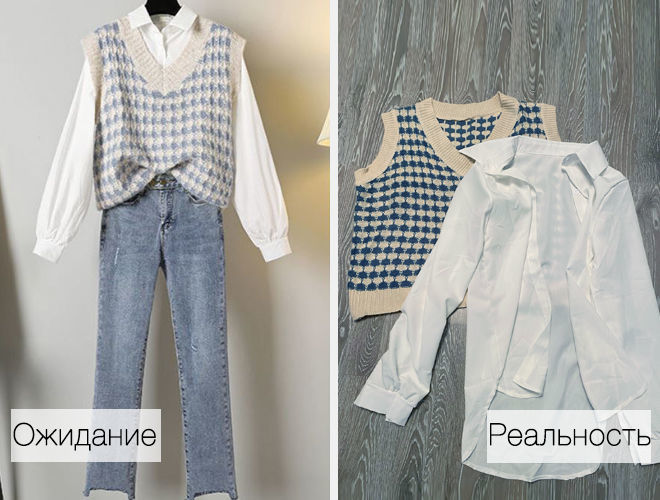 На фото: ретро-комплект из 3 вещей, от 2053 руб. Ну что сказать, снова жилет и снова неудача. Идея комплекта на картинке продавца — это вполне себе милое ретро, но вот в реальности все иначе. Впрочем, трикотажные вещи часто не соответствуют ожиданиям. Поэтому особенно внимательно изучайте карточку товара.