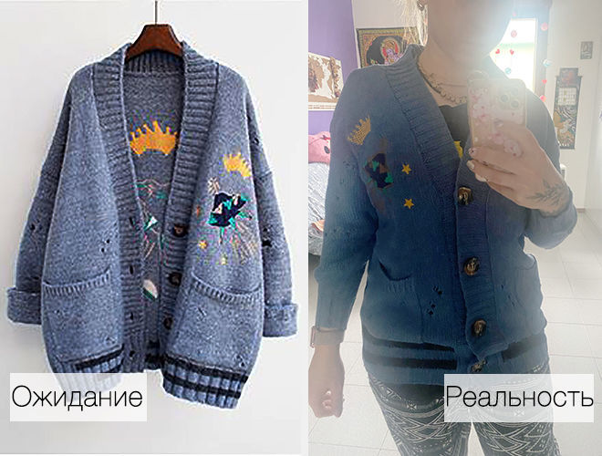 Да еще и дыры эти не создают эффекта потрепанности любимой вещи, больше похоже на встречу с облаком голодной моли. Отзыв покупательницы: «Кофта не совсем такая, как на фото. На фото выглядит как оверсайз, а на деле она практически обтягивает и вообще маленькая. Я обычно ношу М, а эта мне мала.