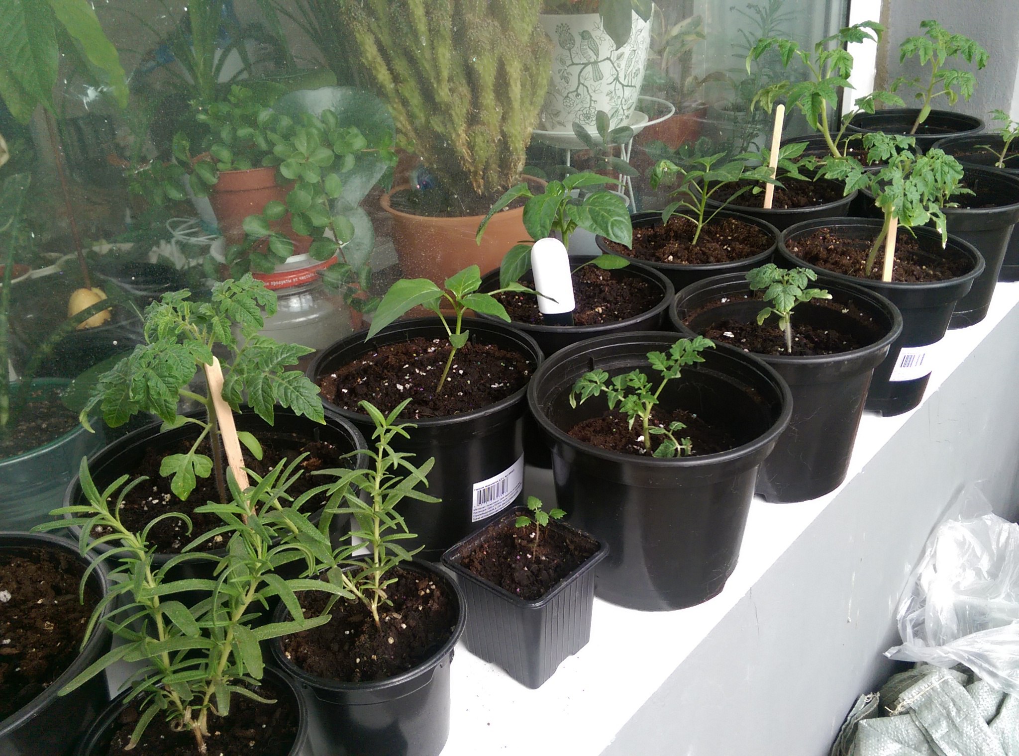 Вот моя балконная банда. Монитор воткнут в центральный горшок.