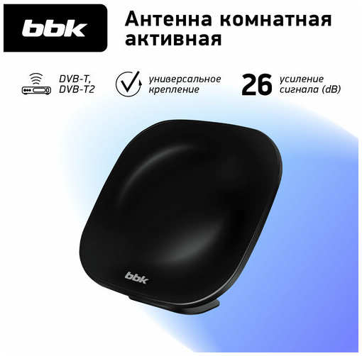 Комнатная DVB-T2 антенна BBK DA02 Комнатная цифровая антенна DA02 имеет стильный дизайн и компактный размер – разместить устройство не составит особого труда. Используется для приема сигналов различных цифровых HDTV-стандартов эфирного телевещания (DVB-T, DVB-T2, ISDB-T, DMB-T/H, ATSC) и радио (DAB). Значительно улучшает