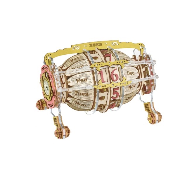 Time Engine Calendar — больше календарь, чем часы. Его также нужно собирать, однако, в данной конструкции присутствуют элементы из прозрачного пластика. Модель отображает число, день недели и месяц, но и время посмотреть тоже можно — сбоку расположен небольшой циферблат.