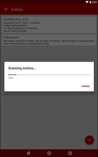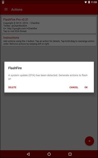 Вместо этого запустите FlashFire после завершения загрузки OTA. Он должен автоматически обнаружить файл обновления и спросить, хотите ли вы сгенерировать действия для его прошивки. Идите и нажмите «ОК».