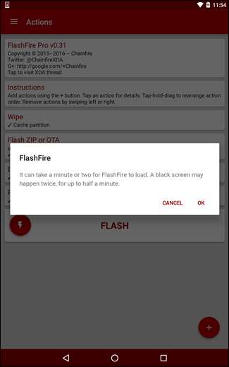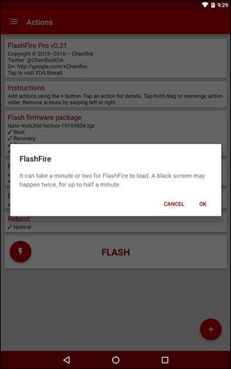 После того, как вы подтвердили все шаги, нажмите кнопку «Вспышка». Вы увидите такое же предупреждение о том, что FlashFire загружается некоторое время и может появиться пара черных экранов. Просто нажмите «ОК».