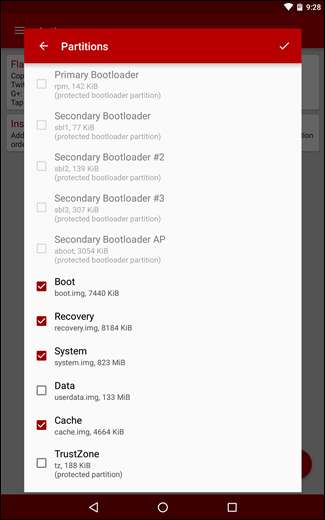 После выбора файла изображения FlashFire просканирует архив, чтобы проверить его содержимое, а затем представит список того, что можно (и будет) прошивать. Вы можете выбрать здесь то, что хотите. Если у вас есть собственное восстановление, и вы хотите, чтобы оно оставалось таким, просто снимите флажок, например, с параметра «восстановление».