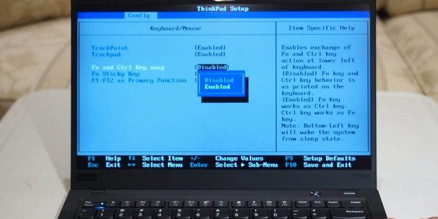 Если вас раздражает, что клавиша Fn находится на месте Ctrl в левом нижнему углу клавиатуры, можно попытаться поменять их местами. Правда, такая возможность доступна не везде. Так, она точно есть в ноутбуках Lenovo.