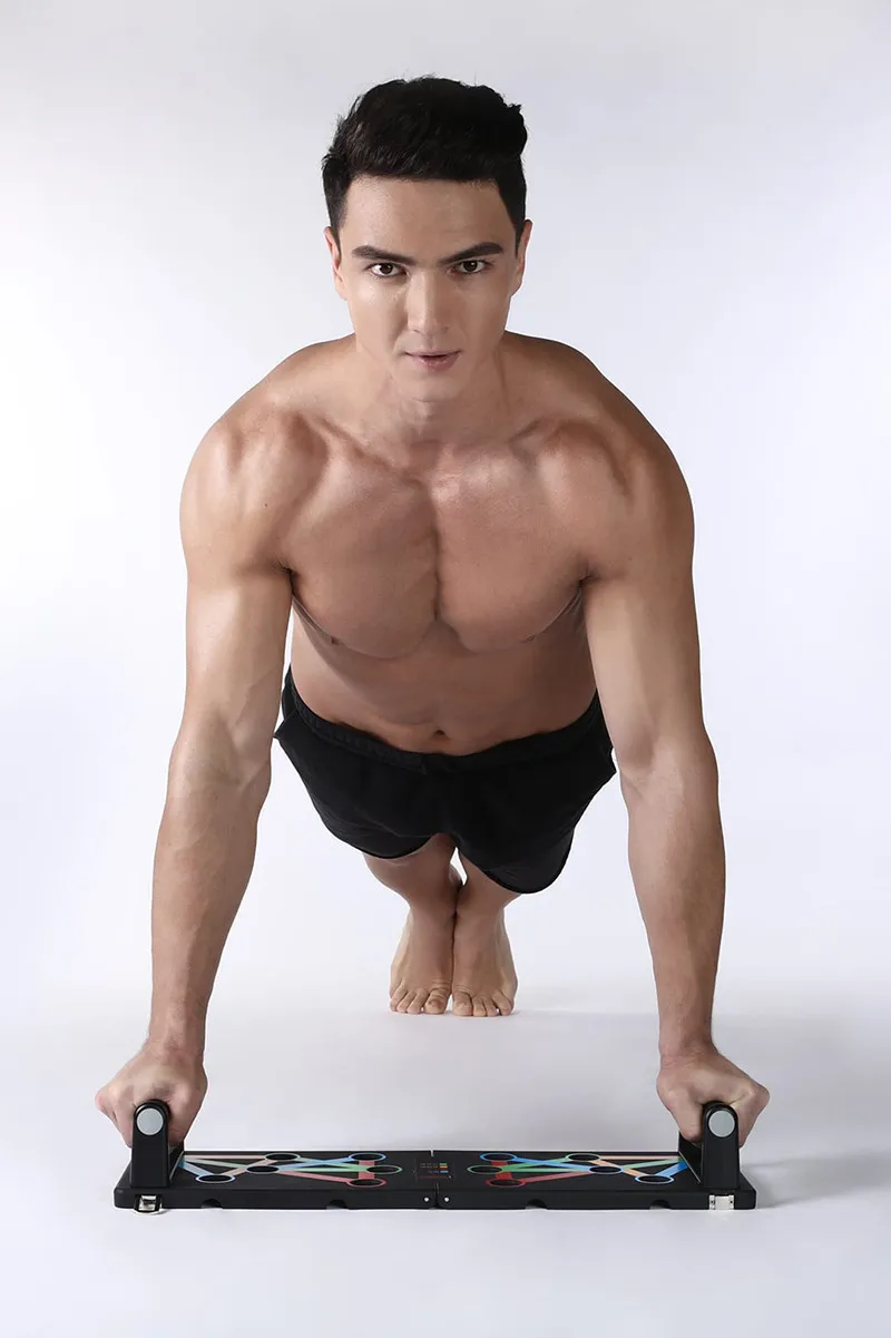 Портативная раскладная доска для отжиманий с помощью которой можно задать любую конфигурацию для прокачки той или иной группы мышц. Несмотря на простую конфигурацию нагрузка на мышцы значительная и весьма ощутимая.