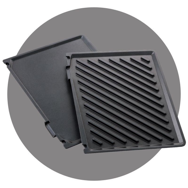 Прибор вмещает в себя не только эргономичность, но и функциональность. Благодаря прочному корпусу из алюминия и термоустойчивому пластику устройство прослужит вам надолго. Съемные рифленые и плоские насадки размером 34 × 24 см станут отличными помощниками при готовке. Гриль имеет компактные размеры: высота – 20 см, ширина 42,5 см, глубина 37 см (с ручкой) и небольшой вес – 8.2 кг, что позволяет легко перемещать прибор по кухне.