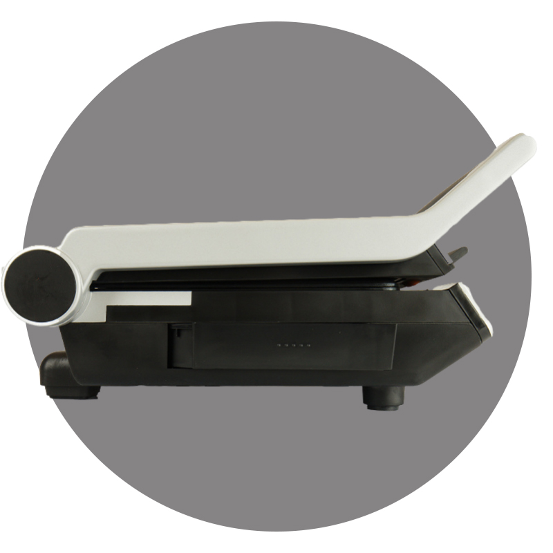Как и другие грили, Haier HG-701 имеет рукоятку и поворотный механизм. Благодаря работе гриля под углом 180°, на ней можно готовить в режиме «Барбекю». В правом шарнире есть кнопка, которая отвечает за открытие крышки гриля.