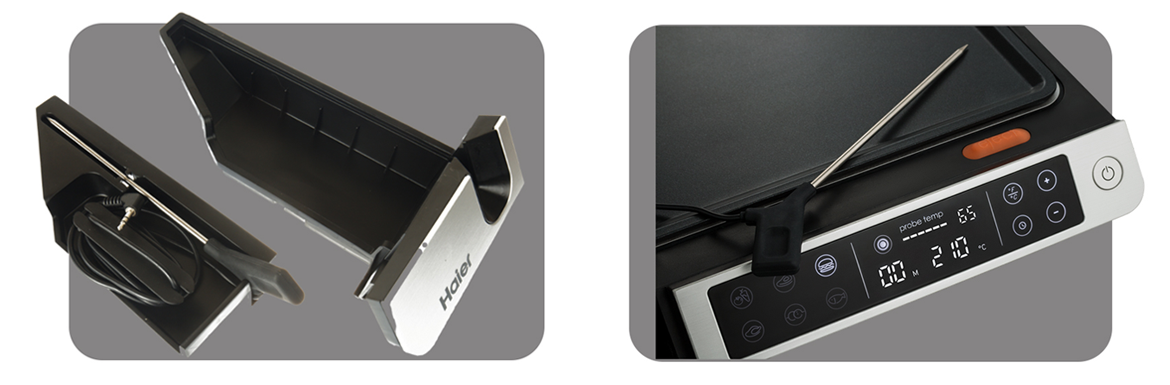 Для того, чтобы воспользоваться термощупом в модели HG-701, необходимо открыть отсек и вытащить устройство. После того как гриль подаст звук о заданной температуре, Вам необходимо воткнуть провод термощупа в специальный разъем и на панели запустить функцию. Кнопки «+/−» помогут настроить градус прожарки.