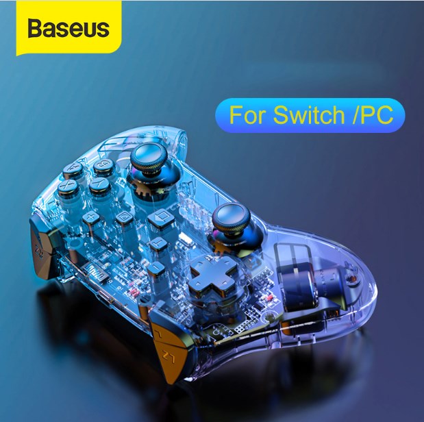 Это отличный геймпад от компании Baseus. Устройство имеет необычный прозрачный корпус, через который видны все электрические компоненты и детали. По беспроводному bluetooth соединению геймпад работает на расстояние до 10 метров на открытом пространстве.