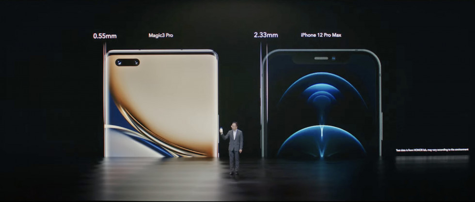 Да, Magic 3 Pro меньше iPhone 12 Pro Max по размерам. А вот экран больше! Аж 6,76 дюймов. При этом рамки у топового айфона аж 2,33 мм. У Honor почти в 5 раз (!) меньше, 0,55 мм .