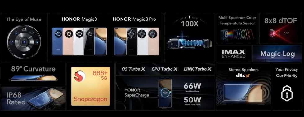 Компания HONOR наконец-то представила флагманскую серию HONOR Magic 3. Эта линейка смартфонов базируется на топовом чипсете Snapdragon 888 Plus, обладает исключительным дизайном, суперсовременной начинкой и, конечно, потрясающими камерами. Расскажем все, что знаем о HONOR Magic 3 и HONOR Magic 3 Pro . И, да, еще HONOR Magic 3 Pro+ .