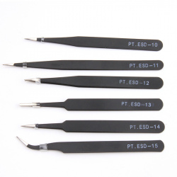- Антистатический. В принципе таковым является диэлектрический (с керамическими губками, пластиковый). Но чаще пинцеты с таким заявленным свойством — это металлические пинцеты, покрашенные чёрной краской, которая является диэлектрической прослойкой между деталью-пинцетом и заряженным статическим электричеством телом человека. Сомневаюсь, что толщины этой краски хватит для предотвращения разряда с того напряжения, которое может сформироваться на человеке… Эквивалентно можно работать в перчатках или замкнуть на землю своё тело проводком.