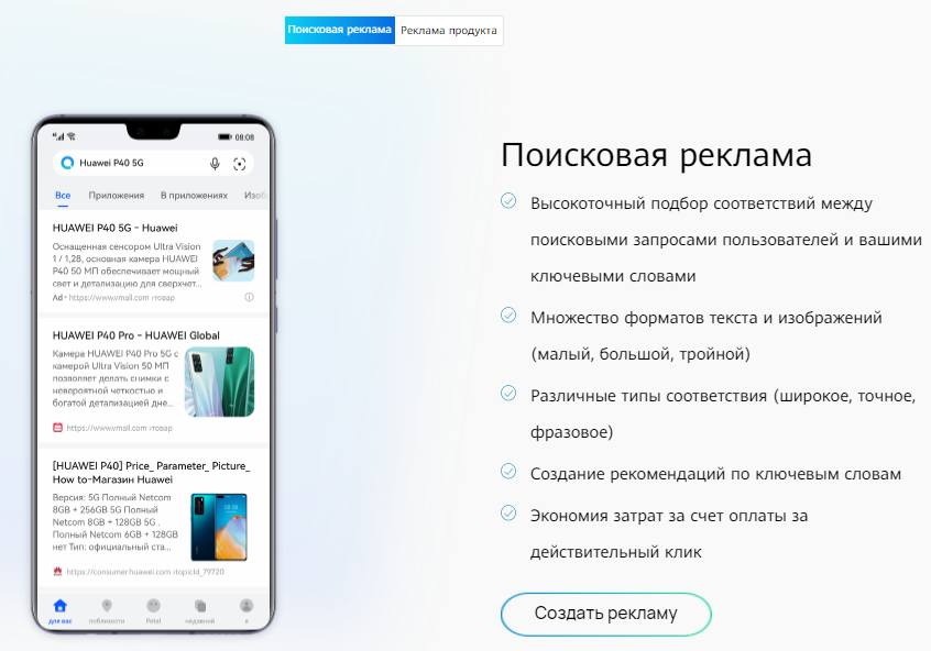 Поисковая реклама доступна только для размещения в Petal Search, реклама загрузки приложения — только в магазине приложений AppGallery.