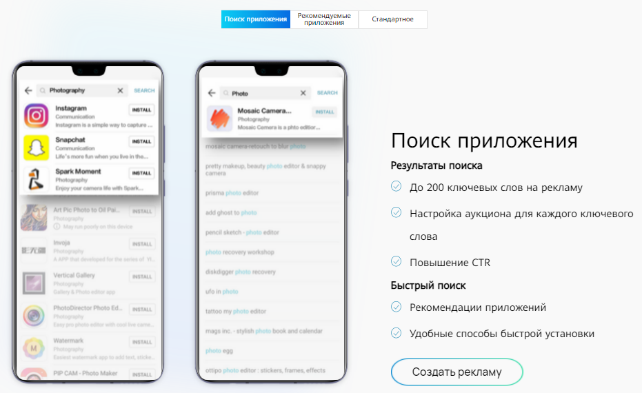 - В поиске приложений, стандартном и быстром. Для стандартного поиска реклама настраивается по ключевым словам (до 200 ключевиков на рекламу).