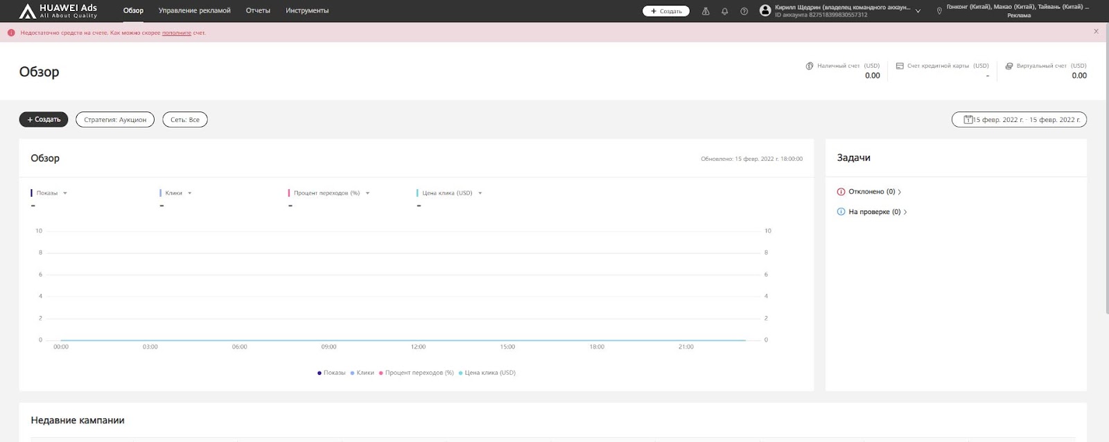 После этого запустится рекламный кабинет. Два основных поля стартовой страницы — «обзор» (статистика по действующим кампаниям) и «недавние кампании» (архив).