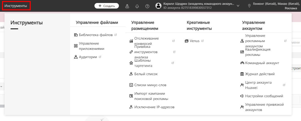 На последней вкладке «Инструменты» — набор инструментов для управления аккаунтом, размещением рекламы и файлами.