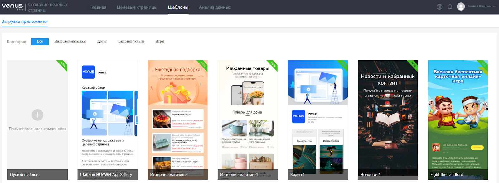 Для создания лендингов Huawei Ads предлагает собственный инструмент Venus (раздел «Креативные инструменты»). Это конструктор посадочных страниц, доступны шаблоны для четырех бизнес-категорий (интернет-магазины, досуг, бытовые услуги, игры).