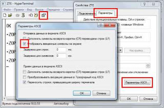 просто закрыть, нажав кнопку «Отмена». Теперь на панели программы нажимаем последнюю кнопку «Свойства» и в открывшемся окне «Свойства: модем» переходим на вкладку «Параметры». Затем нажимаем кнопку «Параметры ASCII» и ставим галочку во второй сверху графе «Отображать вводимые символы на экране».