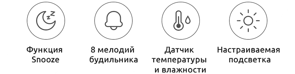 Kомфортный будильник без кнопок. Cоединяется со смартфоном, следит за температурой и влажностью. Яркость экрана автоматически регулируется в зависимости от времени суток и освещенности. Дисплей ночью не раздражает глаза, а днем отлично читается. Отображается текущая дата.