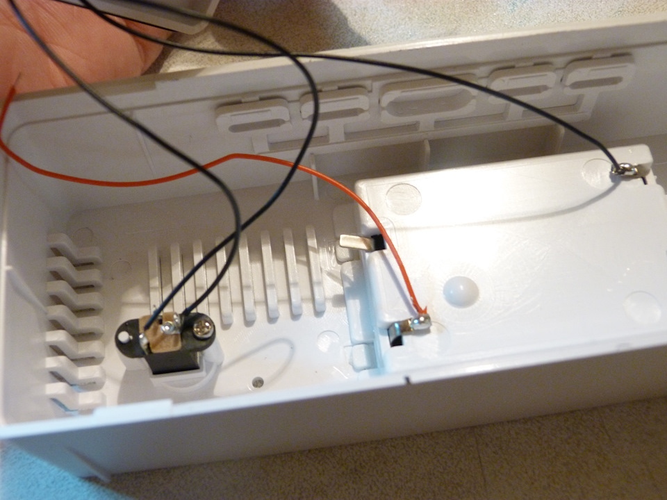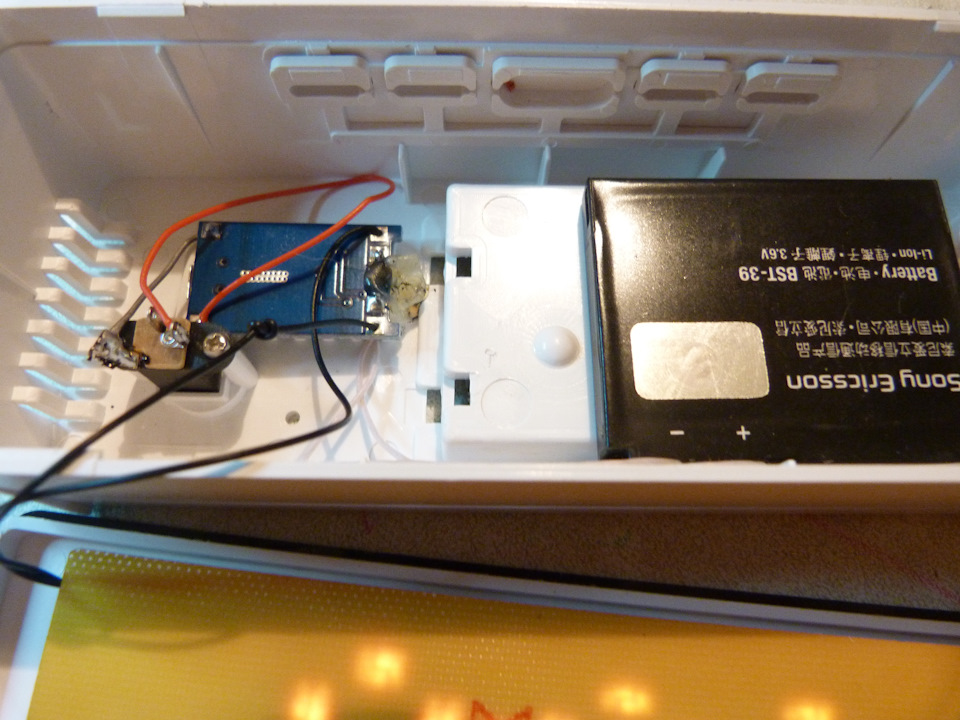 Последний подойдёт любой исправный. Ёмкость чем больше тем лучше, главное чтоб влез в корпус в котором в принципе места предостаточно. Платка имеет три пары контактов подписанных как: in, out, bat и имеют там же обозначенную полярность которую необходимо строго соблюдать. Производим монтаж: на выводы аккумулятора «плюс» и «минус» напаиваем проводки длинной 5-7 см. и подключаем эти проводки к выводам платы bat соблюдая полярность. Отпаиваем от разъёма питания проводки питания платы часов и припаиваем их к выводу out платки стабилизатора так же соблюдая полярность(вывод «плюс» находится по центру разъёма питания часов). На разъём питания припаиваем проводки длинной 5-7 см. и соединяем их с выводом in платы питания не забывая про полярность(«плюс» по центру разъёма).