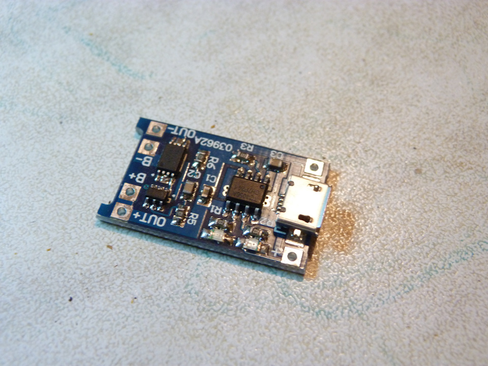 Посему часики подверглись следующей доработке: был изготовлен резервный источник питания. Для изготовления понадобилась платка стабилизатора зарядки для аккумуляторов 18650(у нас не такой но нам вполне подойдёт) и аккумулятор от старого мобильника.
