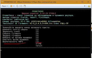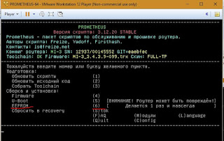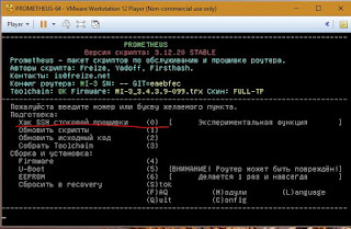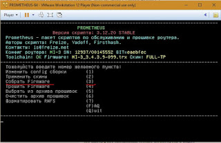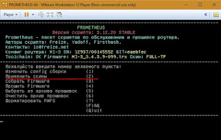 Навигация по скрипту: Shift+С выбрать конфиг вашего роутера из списка, Shift+Q возврат на предыдущее меню, Shift+M выбор дополнительных модулей. Пункты меню выбираются путем ввода их номера. Иногда требуется подтверждение путем ввода Y и нажатия Enter. Для переключения с виртуальной машины на Windows используется сочетание Alt+Ctrl.
