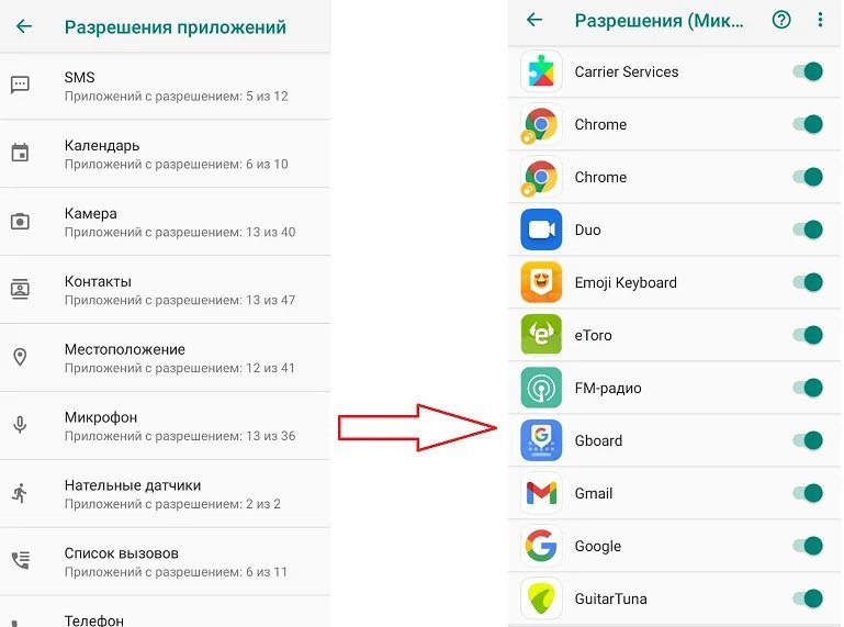 Открываем разрешения, идем в «Микрофон» и снимаем галочки со всех приложений. Оставляем только мессенджеры и «Телефон».