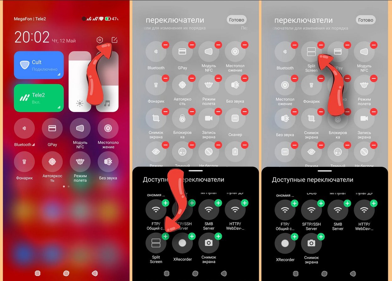 Теперь открываем шторку, нажимаем значок редактирования, с низу в доступных переключателях находим иконку разделения — Split Screen, нажимаем плюсик, она появляется сверху в основном меняю. Удержав на ней перетаскиваем в самый верх для удобства, нажимаем готово.