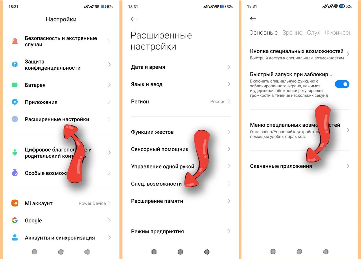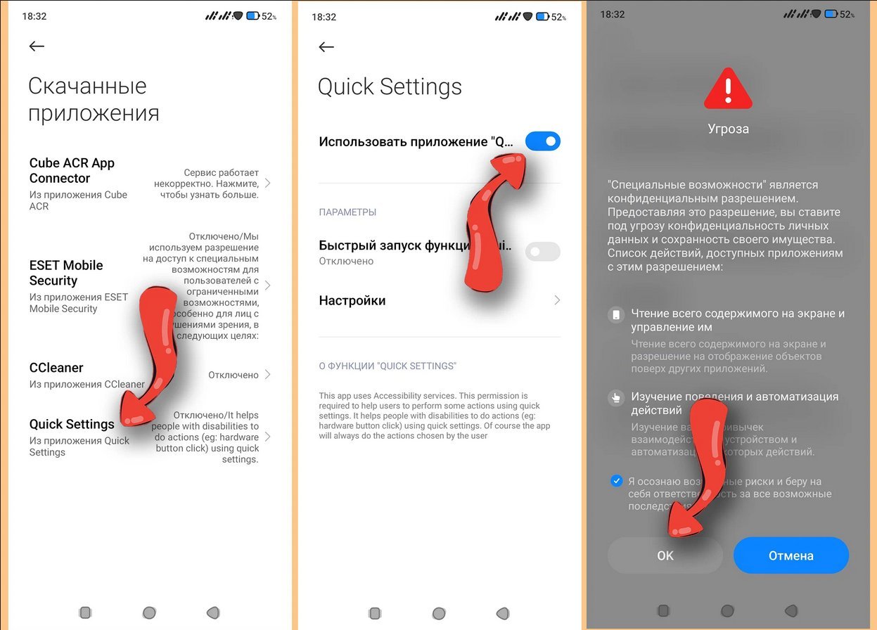 С этого момента в настройках нашей шторки появился значок разделения экрана, но для его использования нужно дать соответствующее разрешение. Для этого зайдём в настройки, расширенные настройки, спец. возможности. Далее кликаем пункт скачанные приложения выбираем Quick Settings, ставим верхнюю галочку.