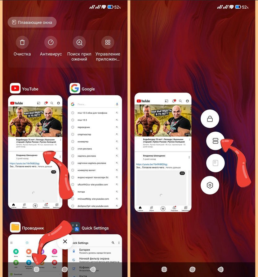 2) Использование двух разных приложений одновременно на одном экране (разделение экрана):
