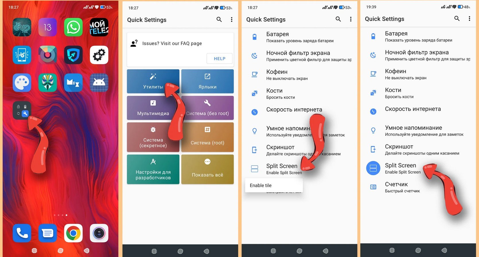 После установки приложения запускаем его, открываем вкладку утилиты находим пункт под названием Split Screen кликаем по нему, далее нажимаем Enable title.