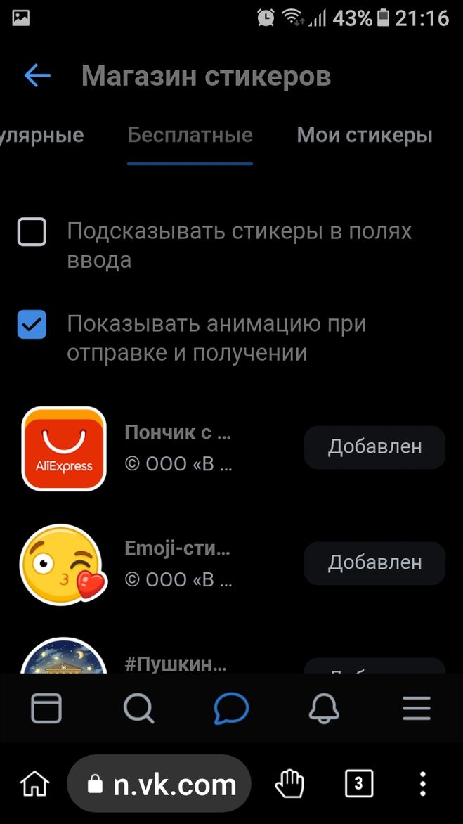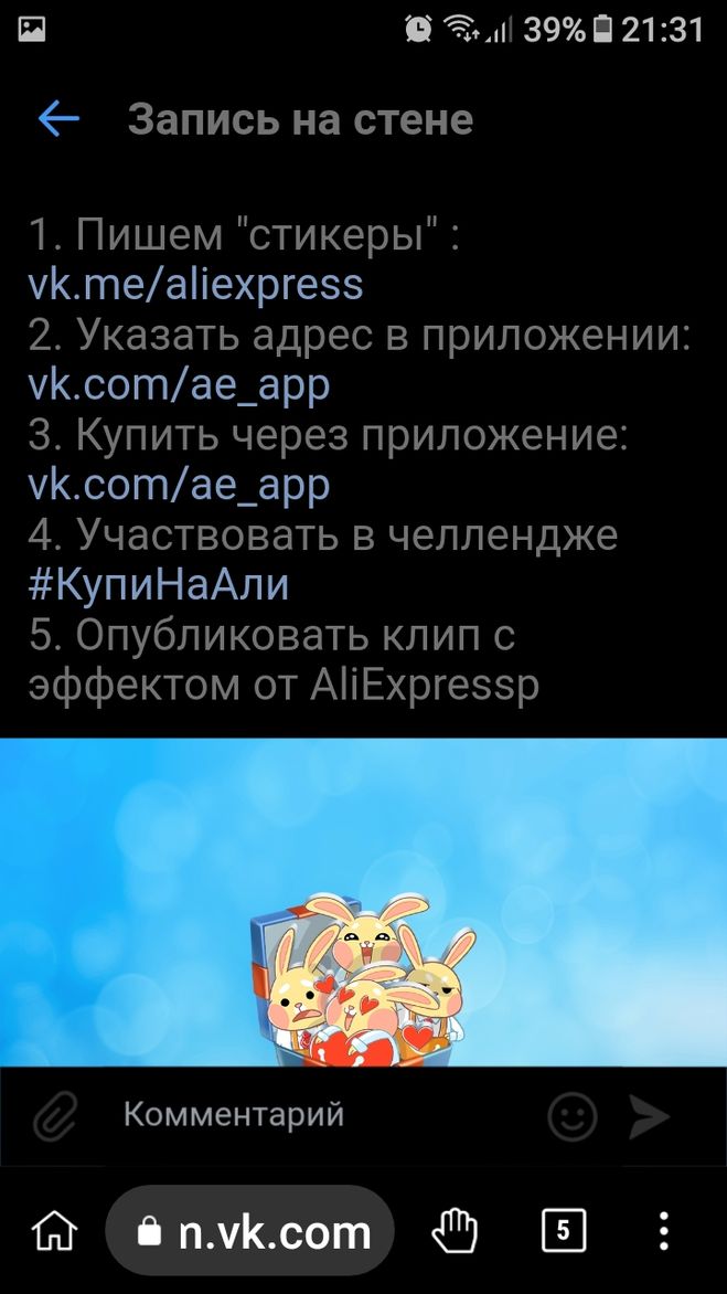 Первый способ, он же наиболее верный — зайти в мини-приложение в самом вк «Алиэкспресс» и там нажать вкладку со стикерами и получить их.