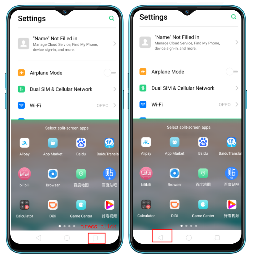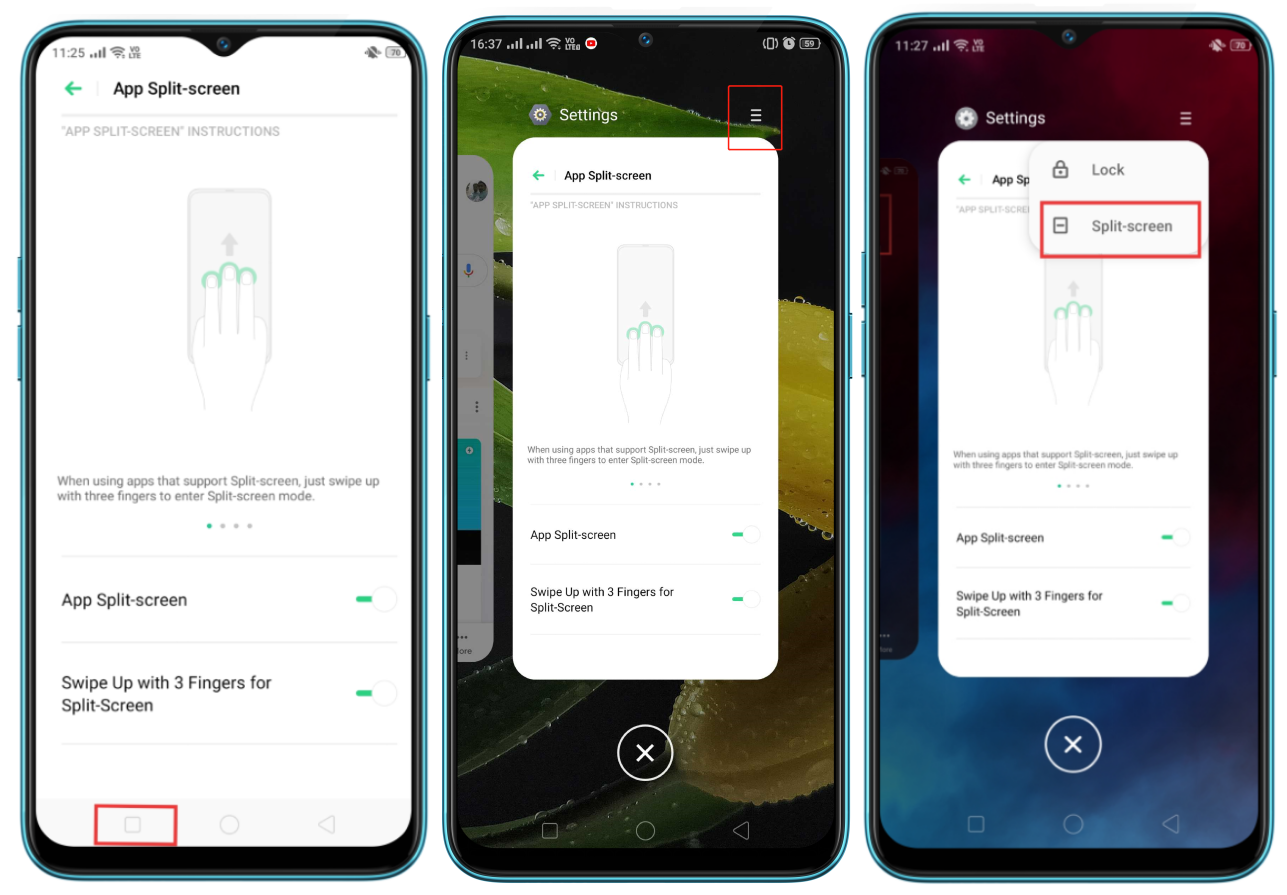 ColorOS 6.0: S ettings > App Split-screen > turn on App Split-screen and Swipe Up With 3 Fingers for Split-screen.