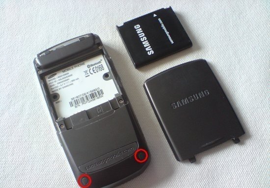 Сначала снимите заднюю крышку и аккумулятор. Удалите 2 резиновых заглушки в нижней части телефона (обведены ниже), и Вы получите доступ к винтам. Открутите все 6 винтов.