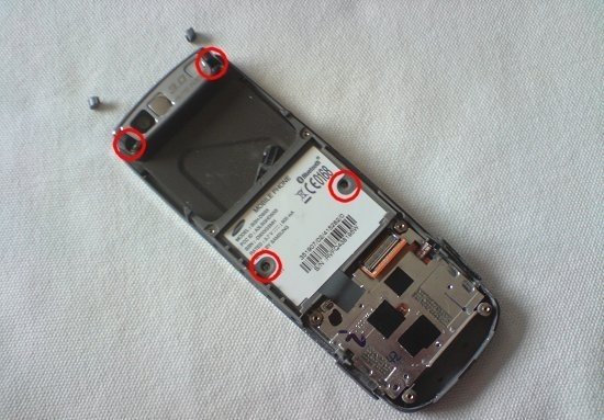 Теперь откройте слайдер. Удалите 2 резиновых заглушки в верхней части телефона, и Вы получите доступ к 2-м винтам. Открутите их и ещё 2 винта, все они обведены ниже.