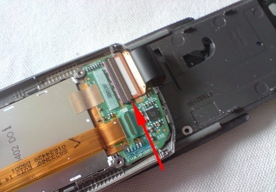 Приступаем к демонтажу основной платы. Отсоединяем коаксиальный антенный кабель, шлейф дисплея и тачскрина, как изображено на фото снизу.