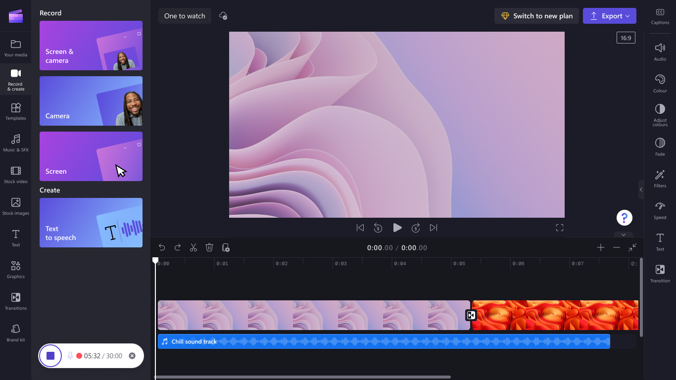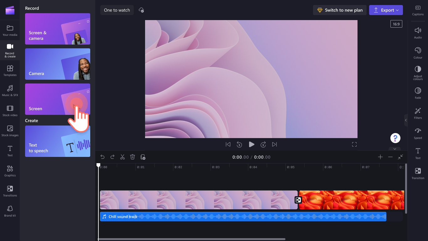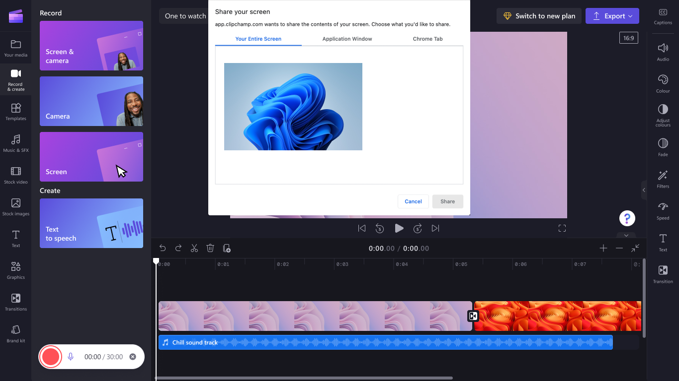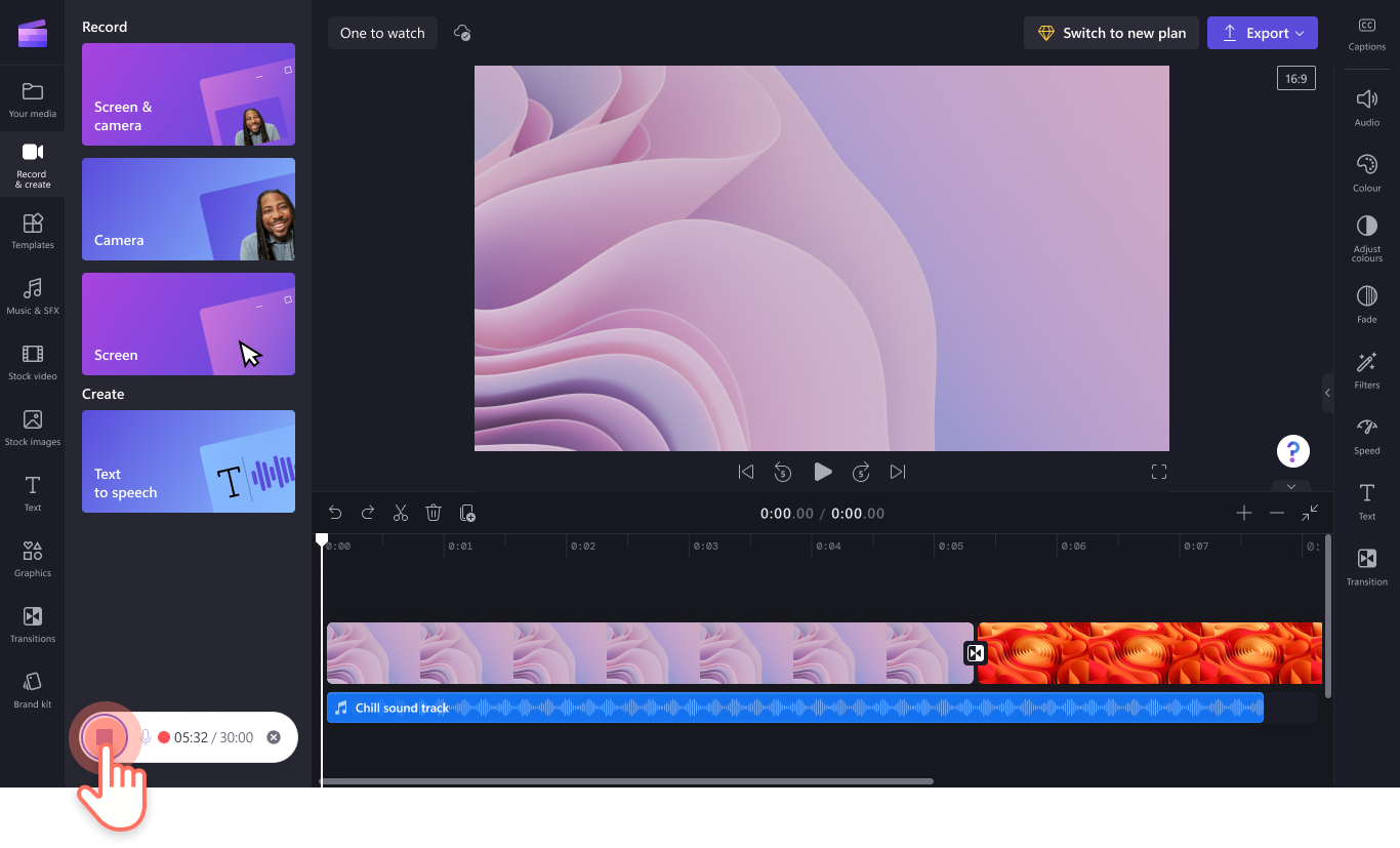 Чтобы воспользоваться онлайн-средством записи экрана со звуком, войдите или бесплатно зарегистрируйтесь в онлайн-редакторе видео Clipchamp.