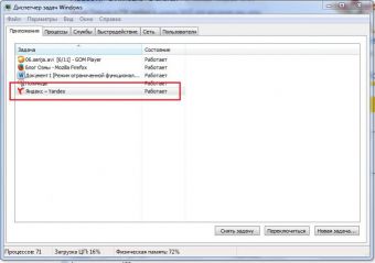 Во вкладке «Приложения» найдите строчку со значком «Яндекс.Браузера», выберите ее и нажмите кнопку внизу «Снять задачу».