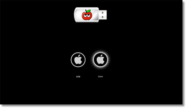 После перезапуска вам потребуется снова загрузиться с USB-накопителя установщика. На этот раз у вас будет 2 варианта. Либо снова загрузитесь в установщик, либо загрузитесь в OS X, которую вы только что установили (и это то, что вам нужно сделать). С помощью клавиш со стрелками выберите диск с именем Lion (или как вы его назвали) и нажмите Enter.