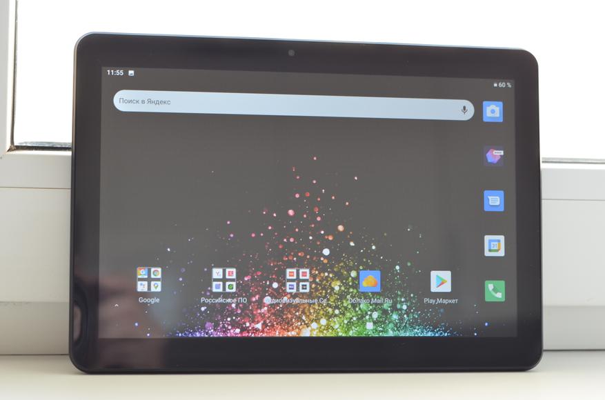 Планшет оснащен довольно большим экраном 10.1 дюйма с IPS матрицей и разрешением 1280х800 пикселей. Экран яркий, цвета четкие и сочные, отклик сенсора мгновенный. Благодаря встроенному G-сенсору планшет поддерживает функцию автоповорота экрана. Вокруг дисплея присутствуют довольно широкие рамки по 1.5 см, что немного портит вид. На верхней части лицевой стороны располагается камера 2МП.