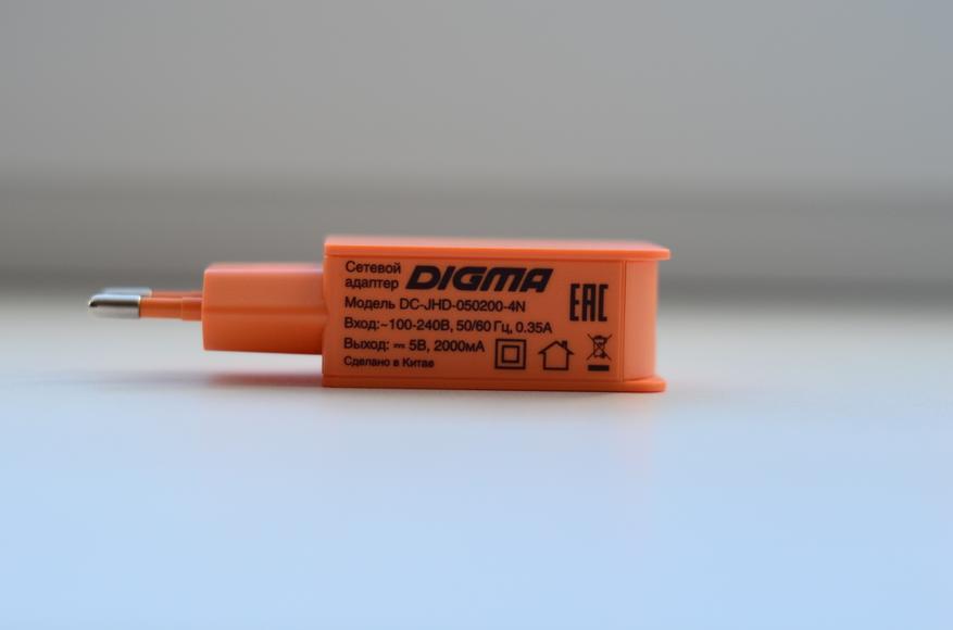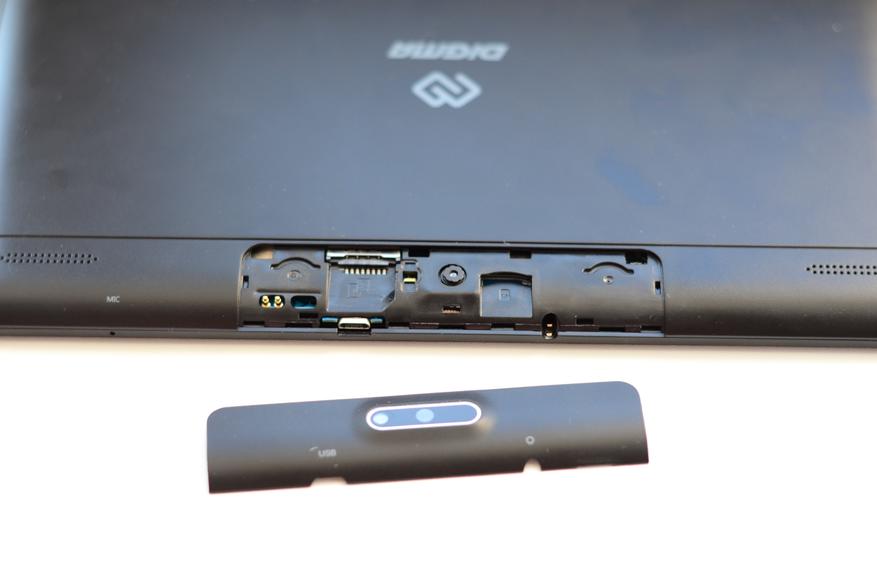 На обратной стороне находится логотип компании DIGMA, название модели и информация о питании планшета. Сверху расположен блок портов подключения и камера.