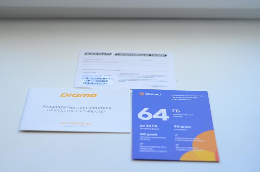 Планшет комплектуется документацией, в которую вошла инструкция, подарочный сертификат от mail.ru и гарантийный талон.