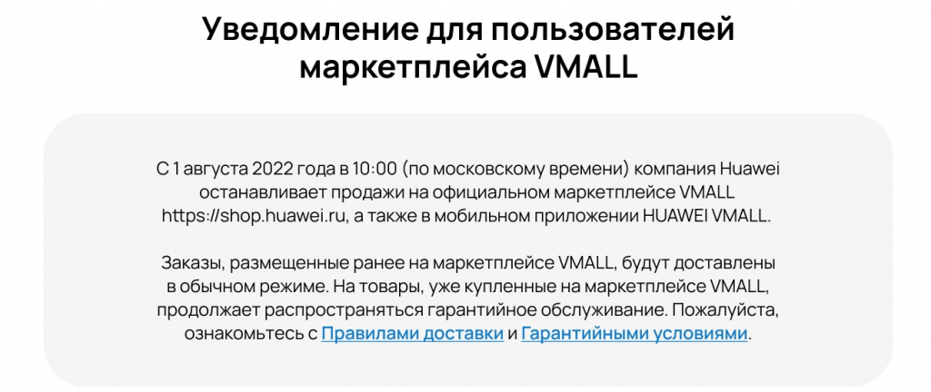 Компания Huawei объявила о закрытии интернет-магазина Vmall. Он работал на сайте shop.huawei.ru и в одноимённом мобильном приложении.
