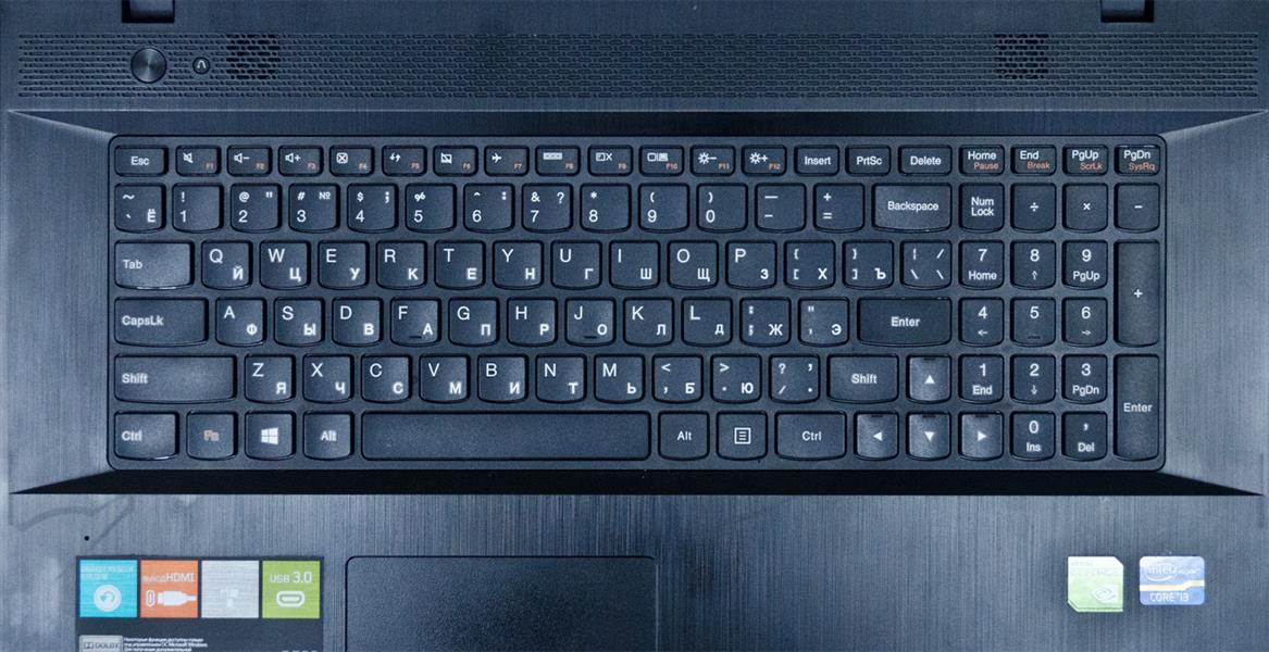В Lenovo G700 используется фирменная островковая клавиатура AccuType с цифровым блоком. Клавиши разнесены на вполне комфортное расстояние, но, учитывая диагональ модели, это расстояние могли бы сделать и побольше. Все клавиши слегка скруглены снизу, подсветки клавиш нет, что не удивительно для бюджетной модели.