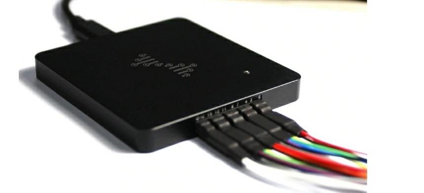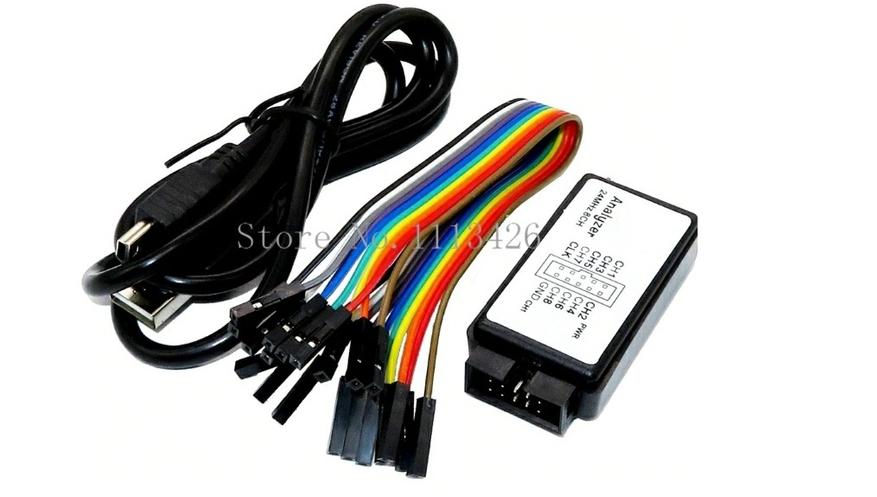 Это простой и недорогой логический анализатор для подключения схемы через USB. Частота семплирования 24 МГц, всего 8 каналов. Подключается простыми проводами DuPont.