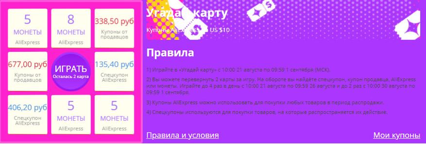 настреляй скидоки угадай карту — хитовые игры во всех распродажах на Алиэкспресс. Заходим и переворачиваем плитки. 2 попытки в день, можно выиграть купон, можно монеты чтобы поменять их на спецкупон Алиэкспресс. И я советую не пренебрегать этой возмножность, требуется буквально пара секунд, а за 30-50 монет можно без проблем получить купон на 3-5$. Ссылка на центр обмена монет ниже.