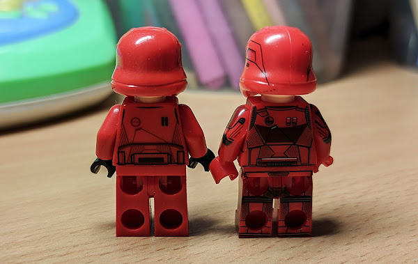 Очень часто люди спрашивали, в чем отличие оигиналов от китайских фигурок, может там пластик вредный, они несовместимы, еще что-то не то с ними. Так что предлагаю посмотреть на вышеприведенное фото. Это штурмовики ситхов. Отличить оригинал от копии с первого взгляда сможет только разве что продвинутый коллекционер. Оригинальная фигурка LEGO на фото слева.