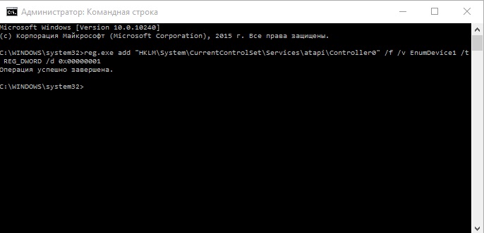reg.exe add «HKLMSystemCurrentControlSetServicesatapiController0» /f /v EnumDevice1 /t REG_DWORD /d 0x00000001